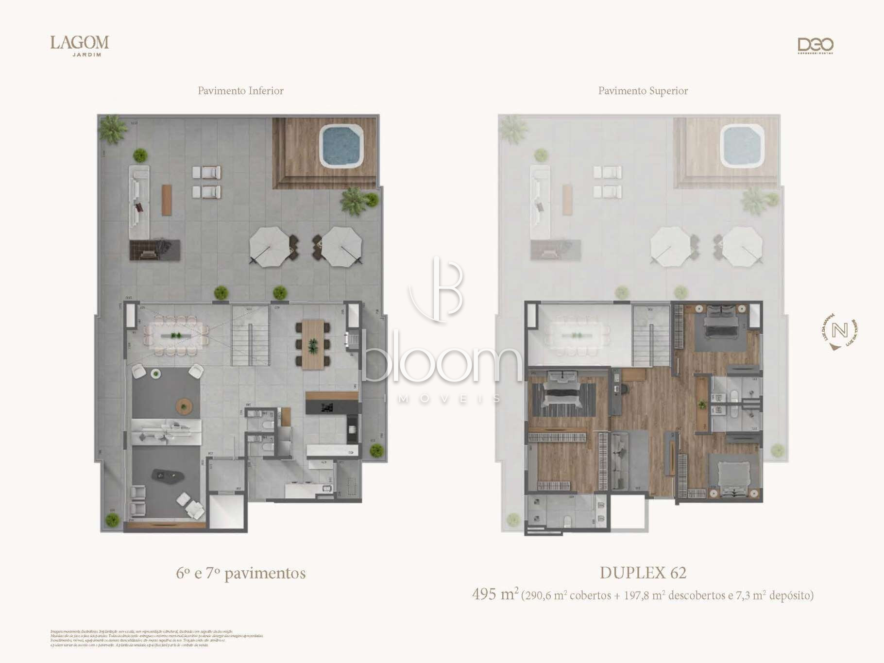 290,60m² de apartamento + 197,80m² de terraço + 7,30m² de depósito = 495m² privativos