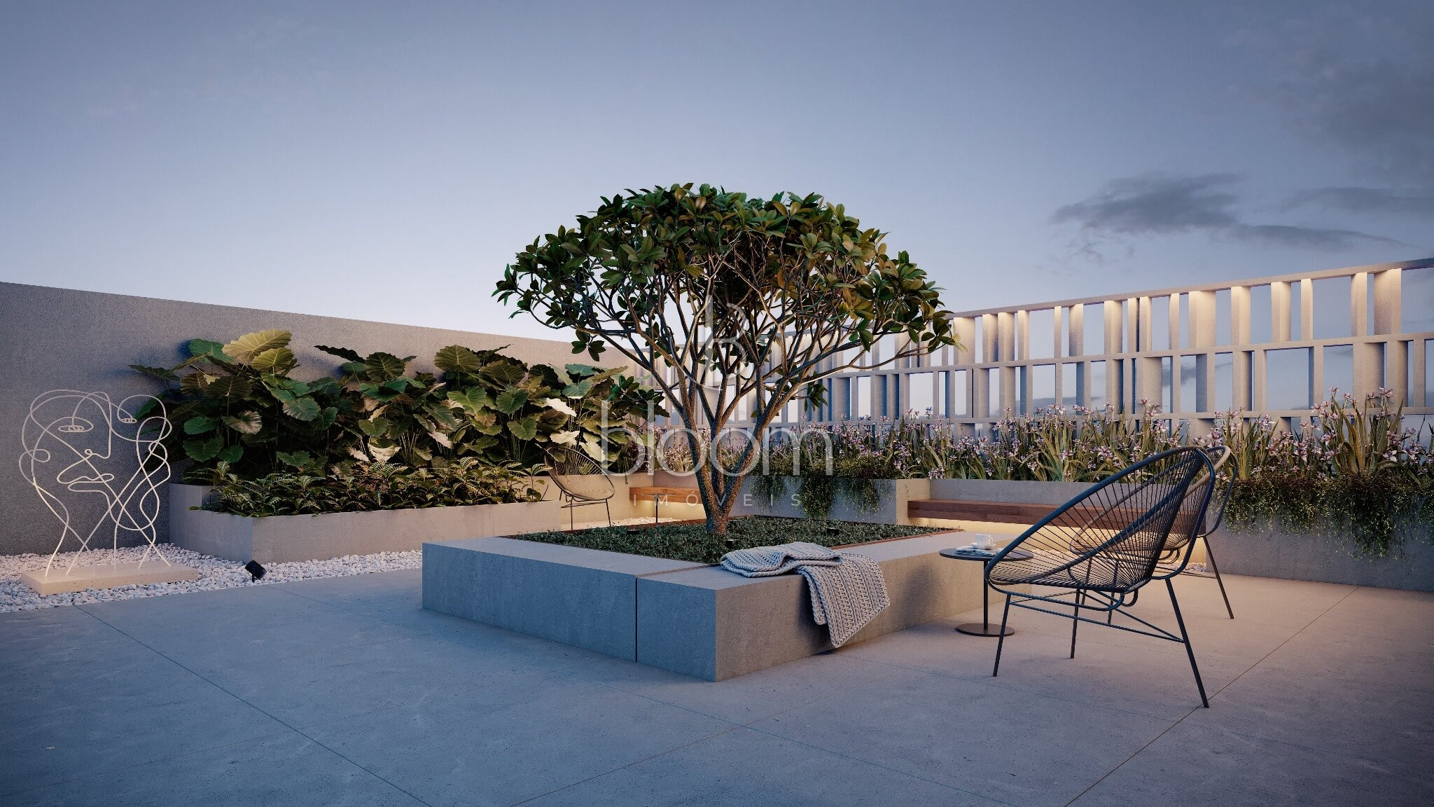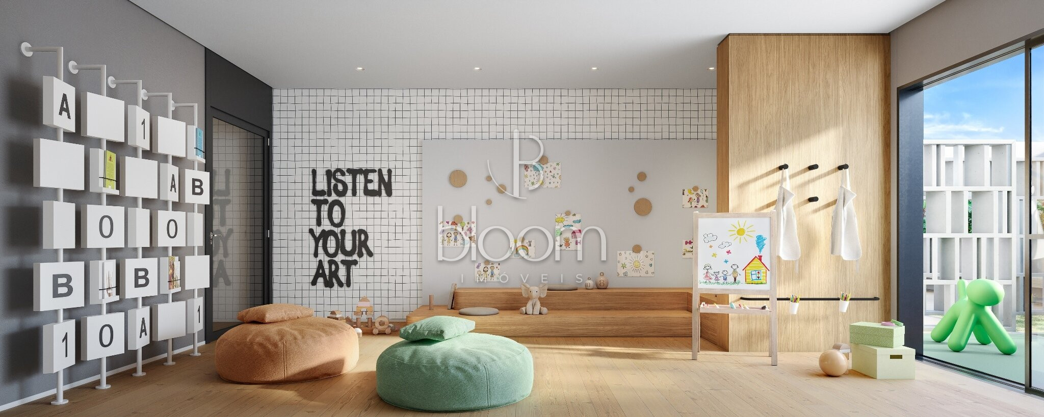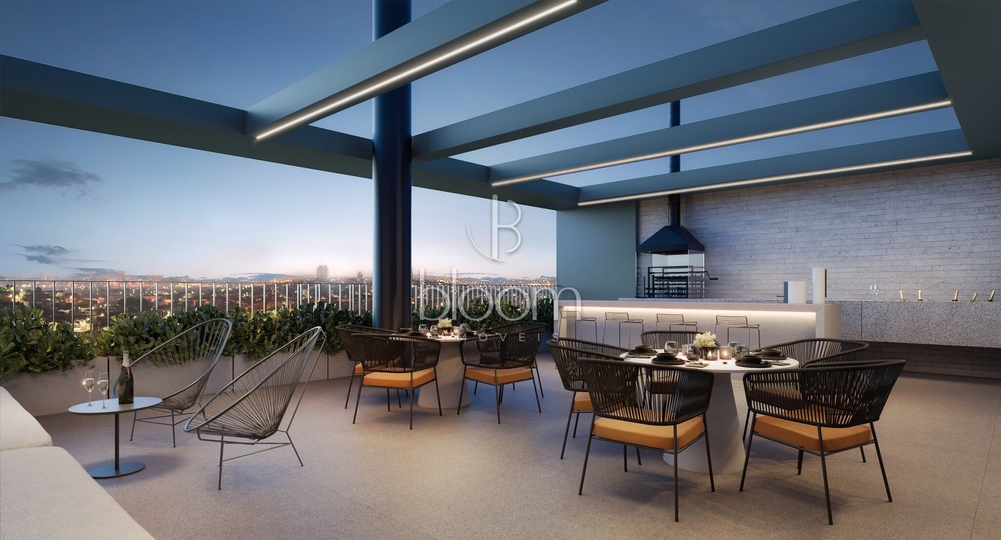 Guarita. Hall de entrada, Central de entregas e delivery, Espaço gourmet, Lounge externo, Playground, Brinquedoteca, Copa e bwc para funcionários, Sala de jogos, Espaço fitness, Terraço coberto, Praça central, Piscina coberta aquecida, Solarium, Salão de festas.