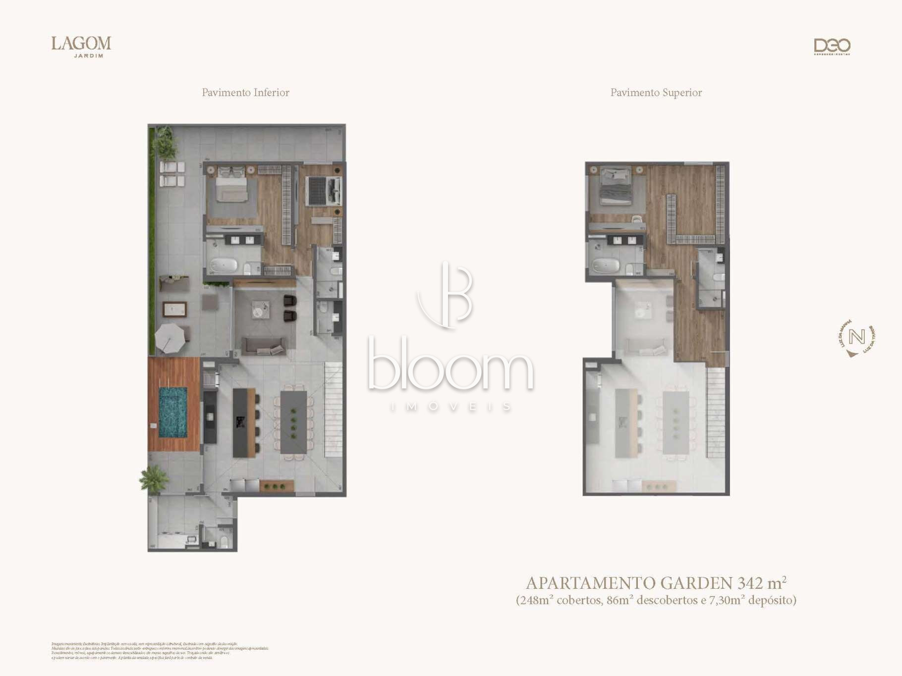 248m² de apartamento + 86m² de jardim externo + 7,30m² de depósito = 342m² privativos