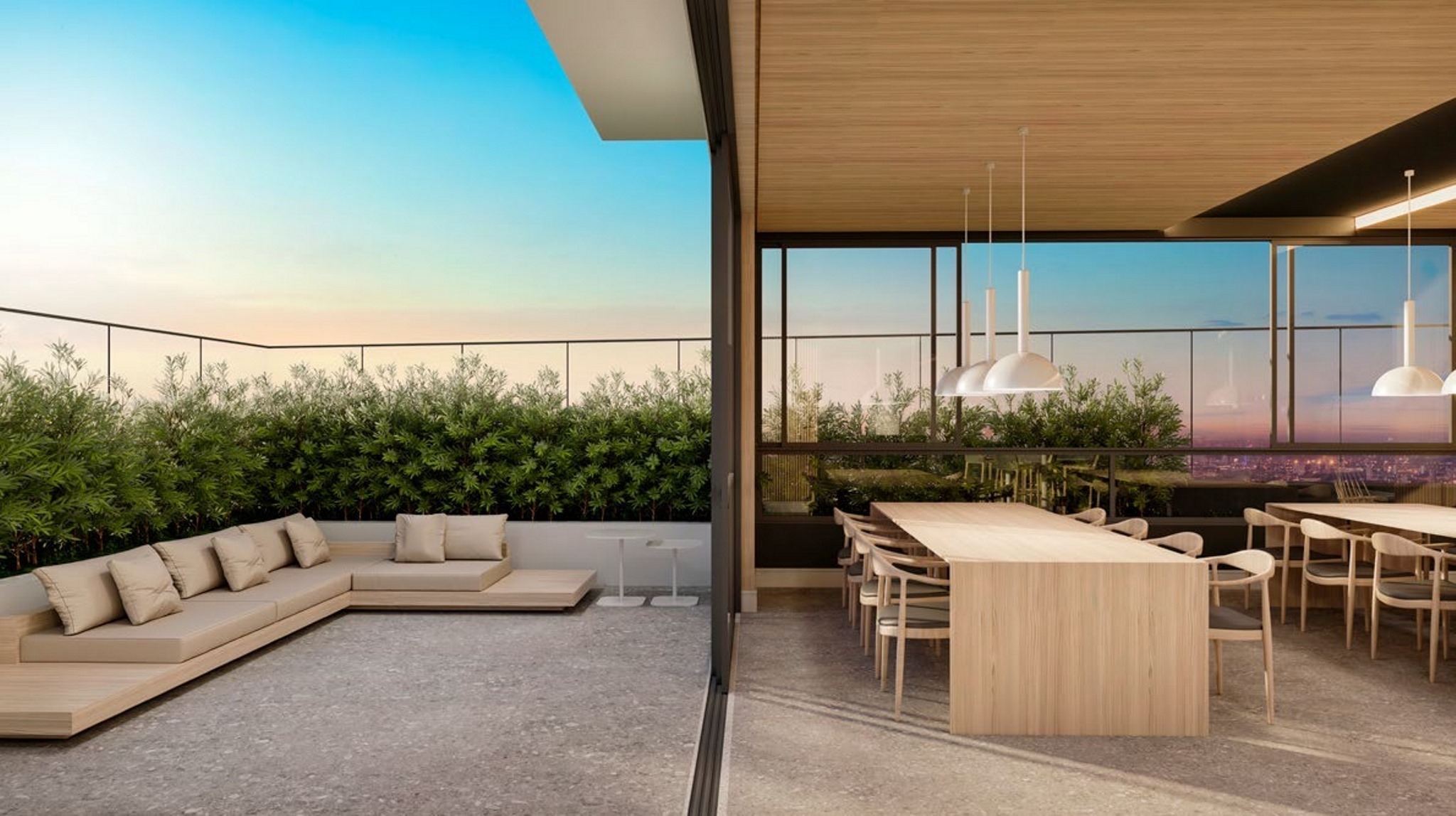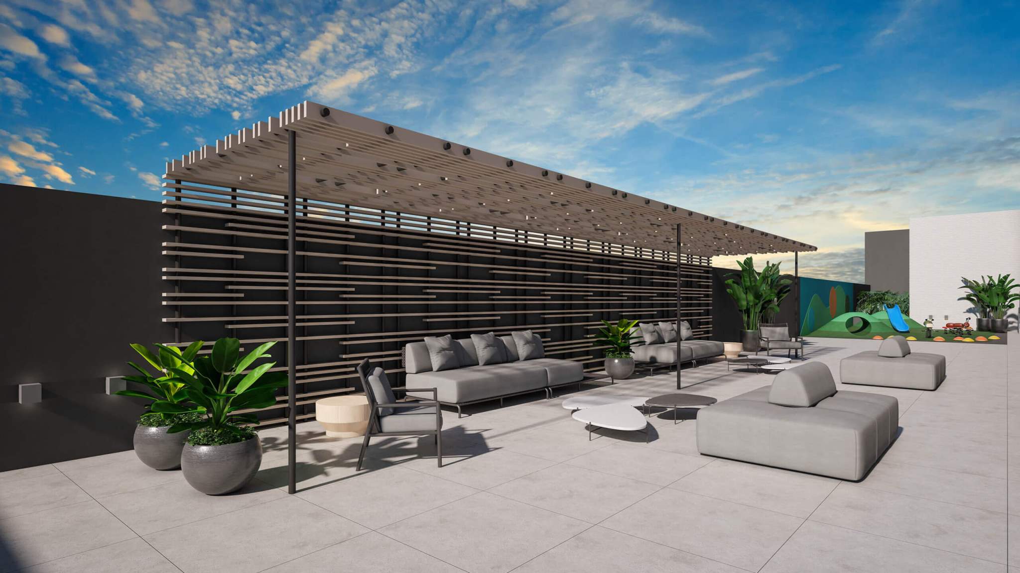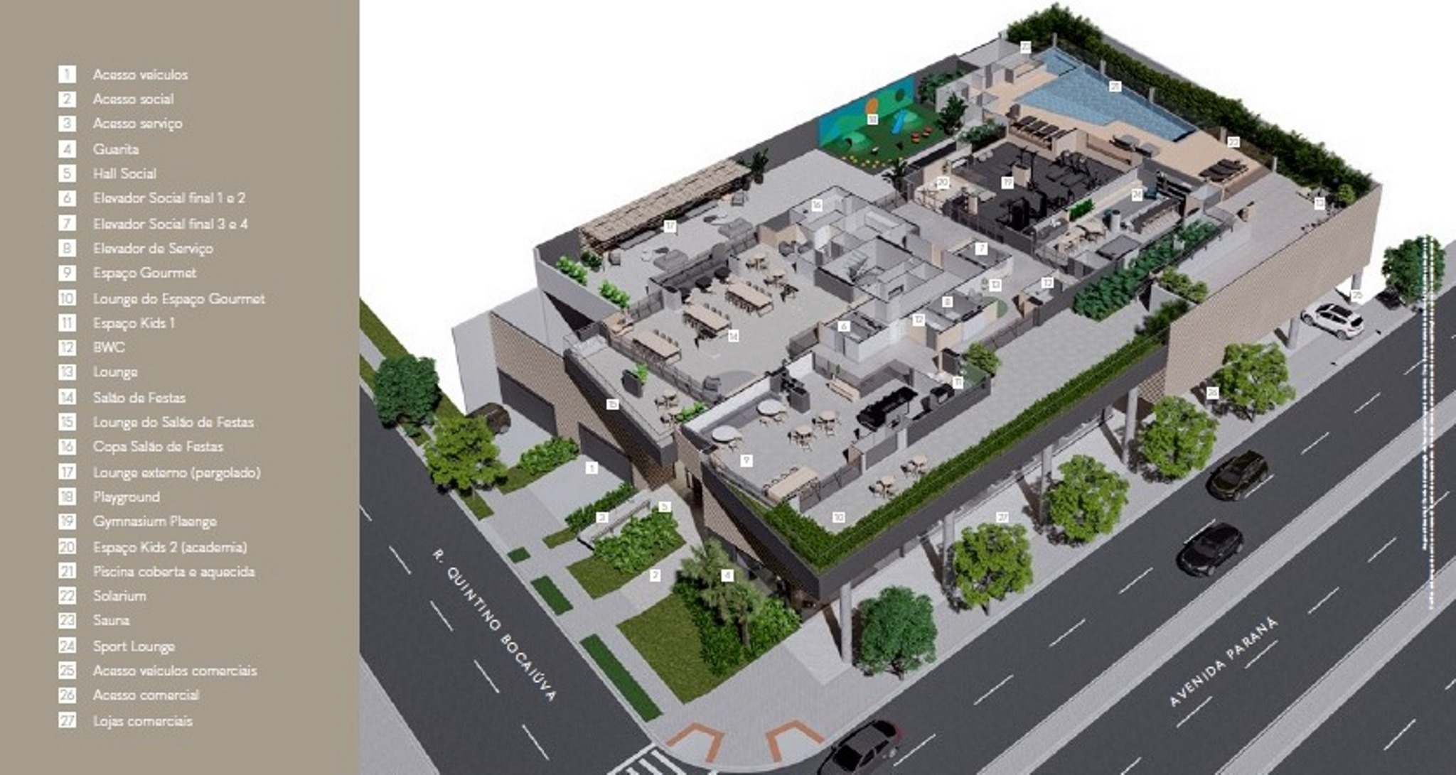 Guarita, Hall social e portaria, Sistema de câmeras de segurança, Infraestrutura para Wifi no térreo, Central de delivery, Piscina coberta e aquecida, Plaenge Parking Design (Piso epóxi na garagem e projeto personalizado de sinalização), Infraestrutura para abastecimento de veículos elétricos nas garagens (1 ponto por apartamento), Bicicletário, Espaço gourmet com lounge, 2 espaço kids, Salão de festas com lounge e copa, Lounge externo, Playground, Fitness, Solarium, Sauna.
