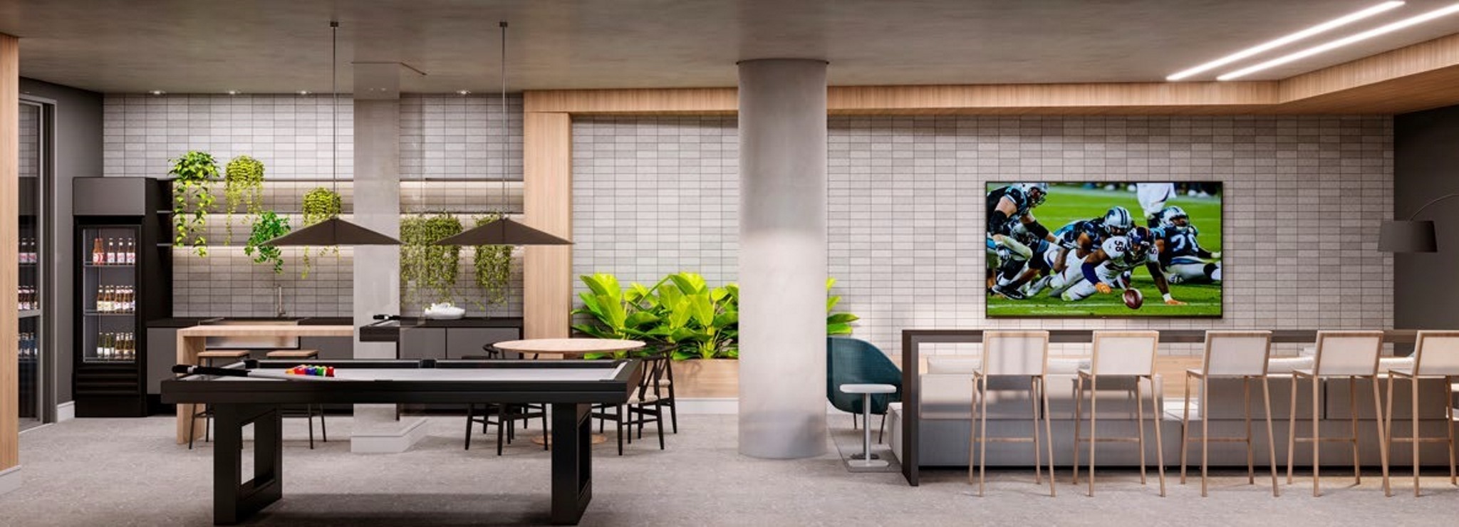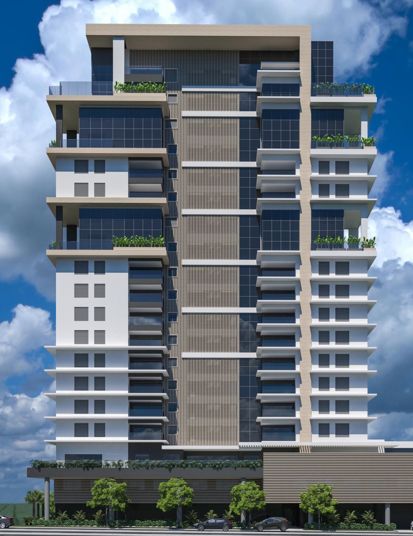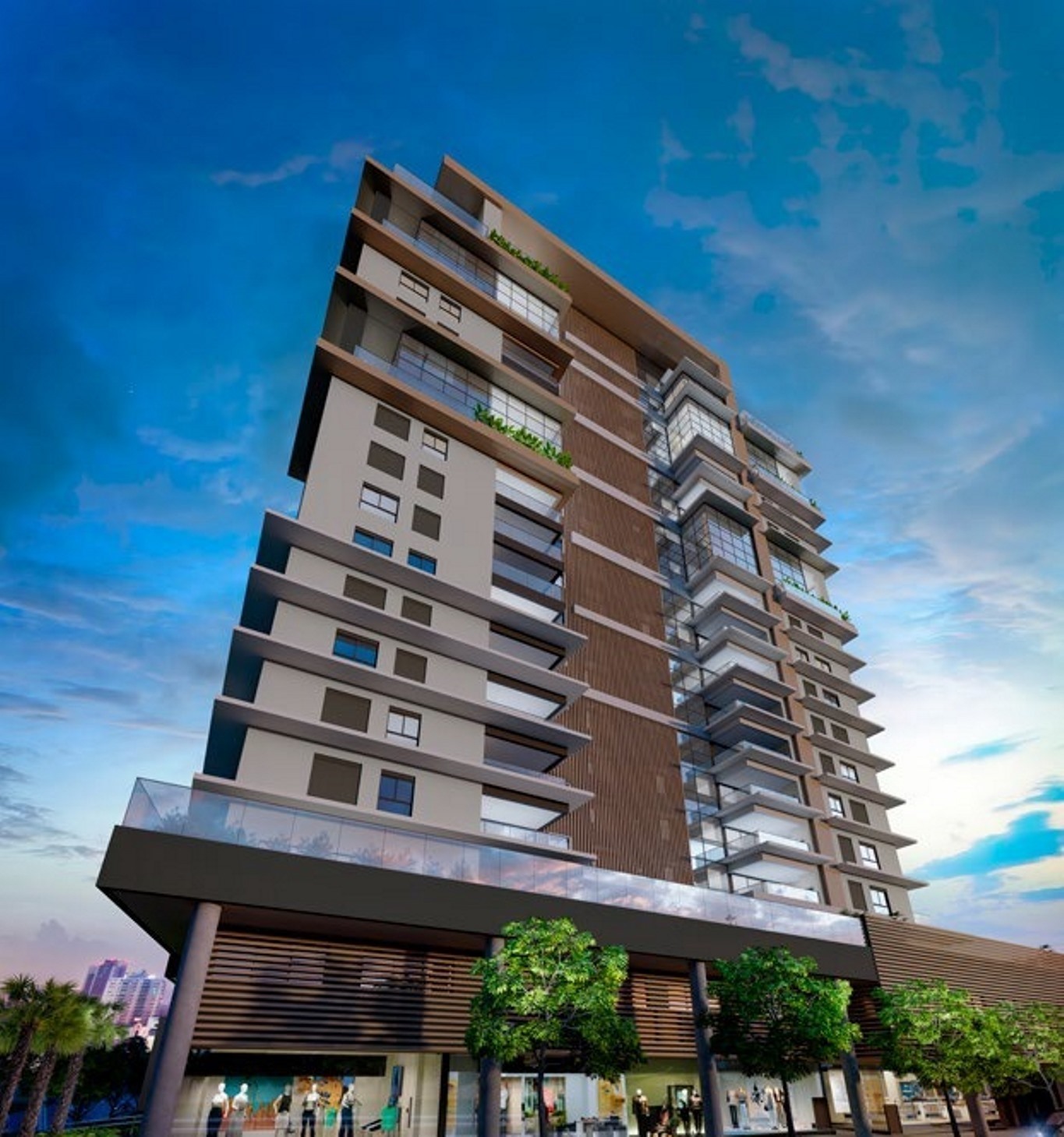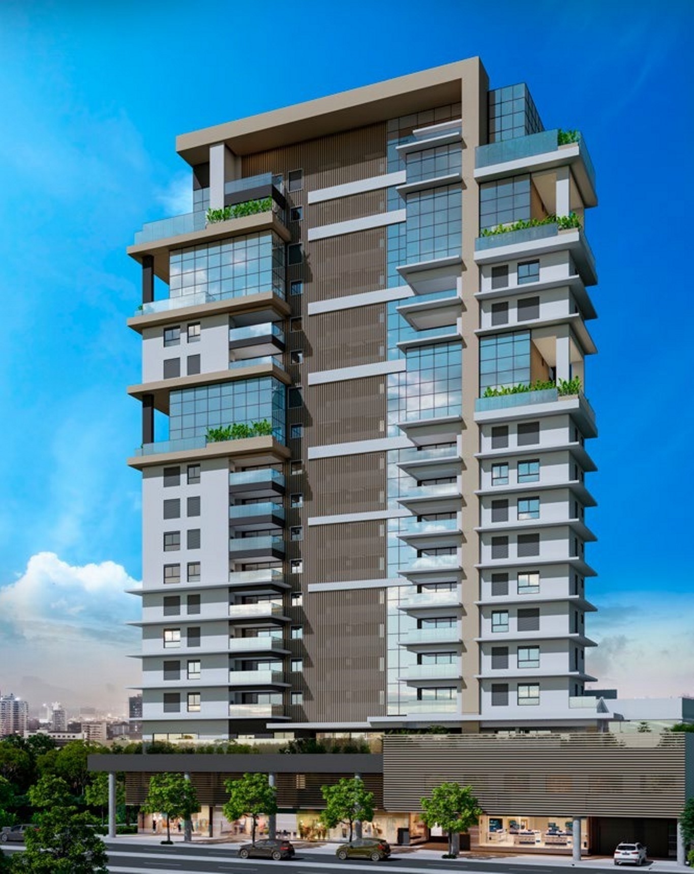 Com linhas retas e características modernas como pele de vidro e brises verticais, a fachada do Fifty se destaca na paisagem de maneira leve e contemporânea. O resultado do projeto de arquitetura é um empreendimento de visual harmônico, mas que a transmite elegância e imponência, elementos presentes no conceito do produto.