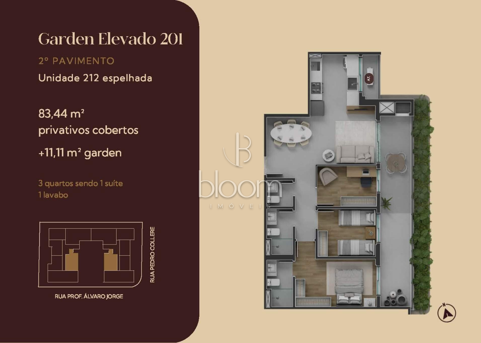 83,44m² de apartamento + 11,11m² de terraço exclusivo = 131,35m² privativos