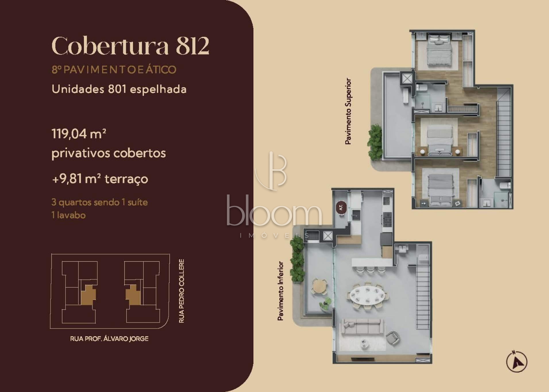 119,04m² de apartamento + 9,81m² de terraço = 128,85m² privativos
