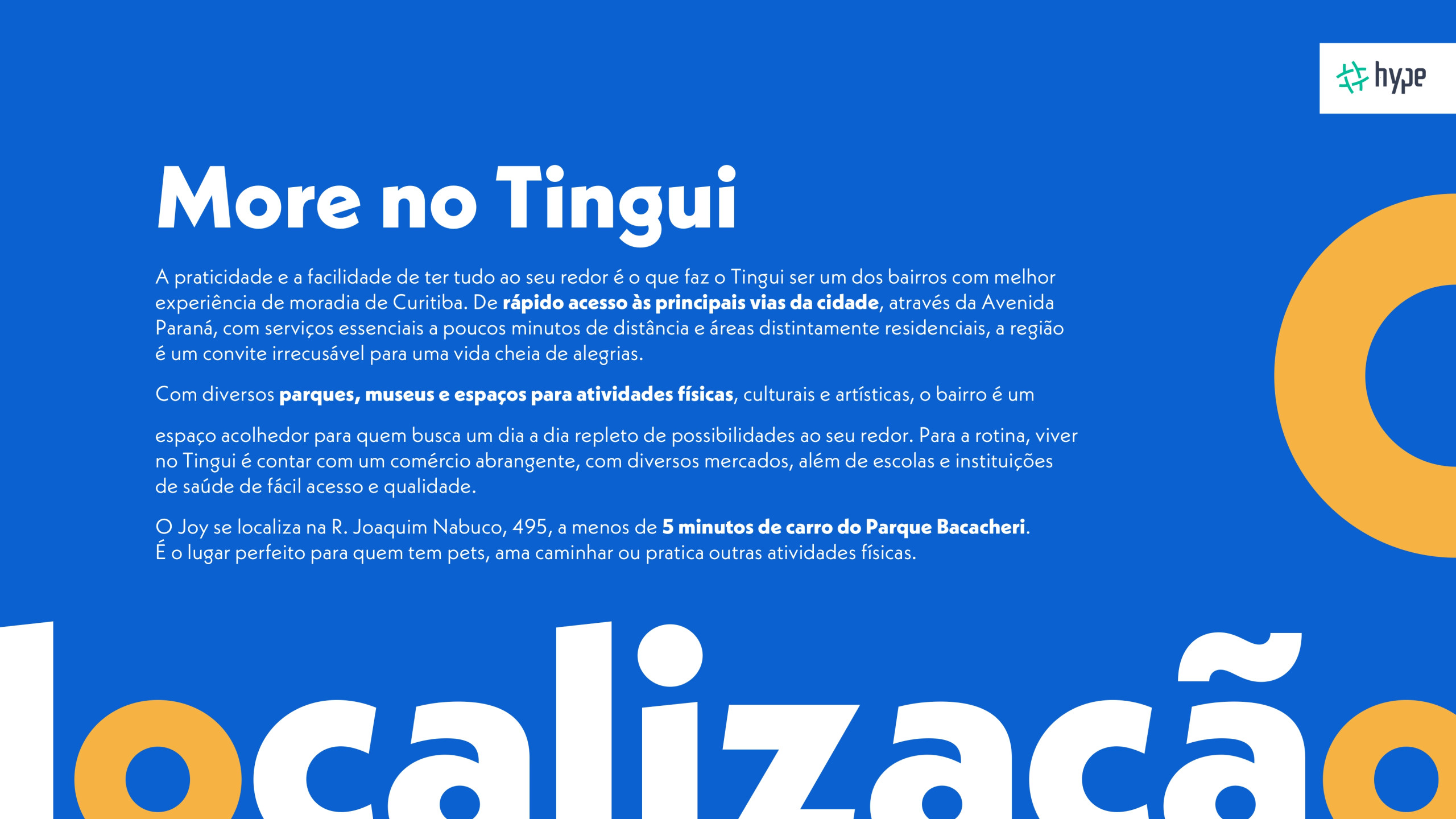 A praticidade e a facilidade de ter tudo ao seu redor é o que faz o Tingui ser um dos bairros com melhor experiência de moradia de Curitiba. De rápido acesso às principais vias da cidade, através da Avenida Paraná, com serviços essenciais a poucos minutos de distância e áreas distintamente residenciais, a região -é um convite irrecusável para uma vida cheia de alegrias. Com diversos parques, museus e espaços para atividades físicas, culturais e artísticas, o bairro é um espaço acolhedor para quem busca um dia a dia repleto de possibilidades ao seu redor. Para a rotina, viver no Tingui é contar com um comércio abrangente, com diversos mercados, além de escolas e instituições de saúde de fácil acesso e qualidade.
